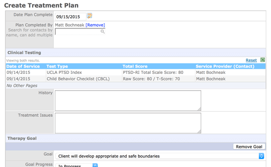 Including DSM V diagnoses, therapy Goals and Outcomes, even Progress Notes and Followups, all easily reportable.